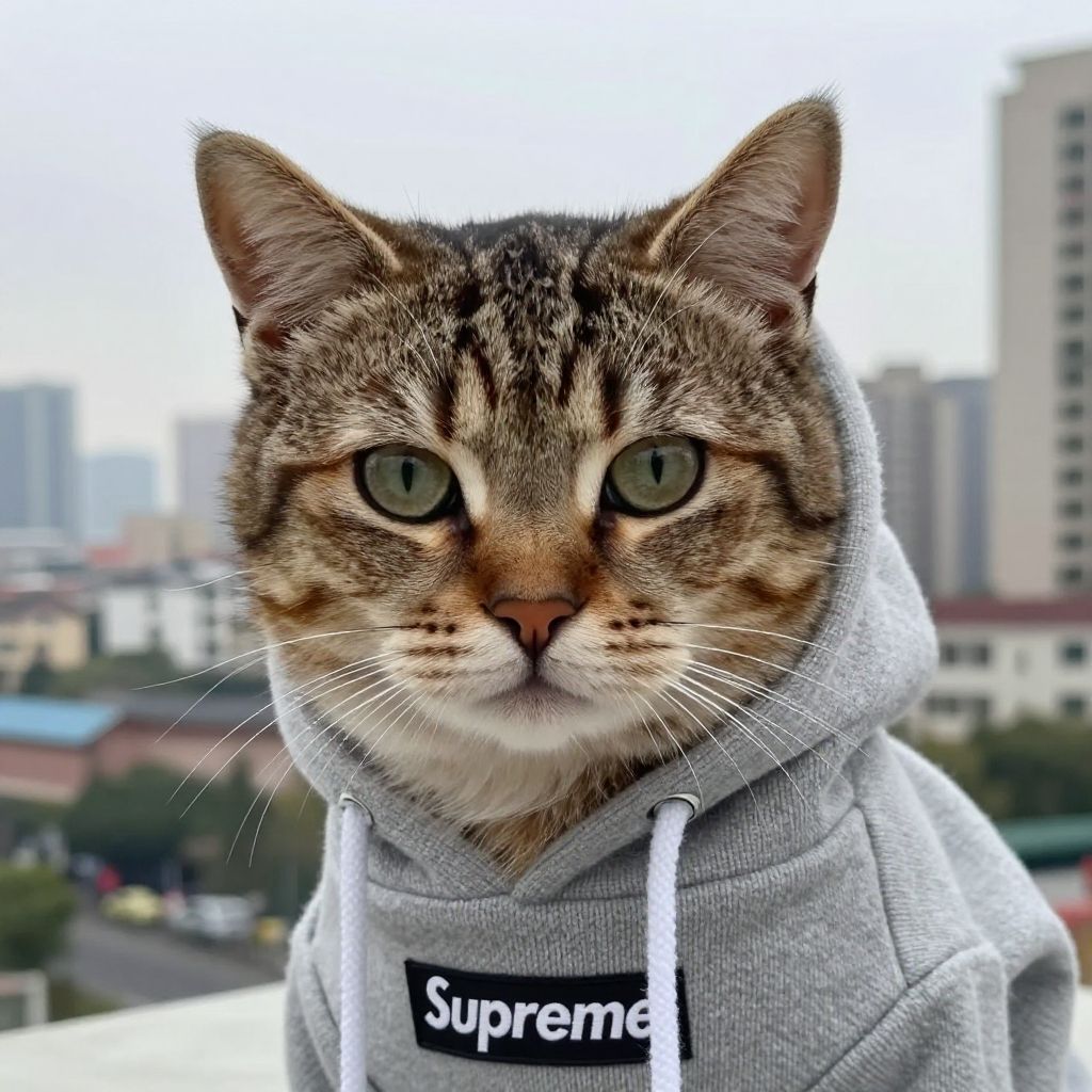 Close-up of cat wearing supreme hoodie with cityscape background, photorealistic fur and fabric textures, ambient natural light, trendy street style