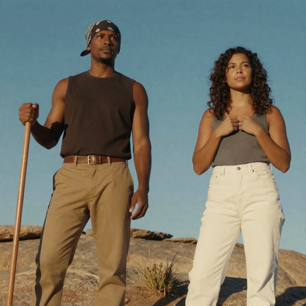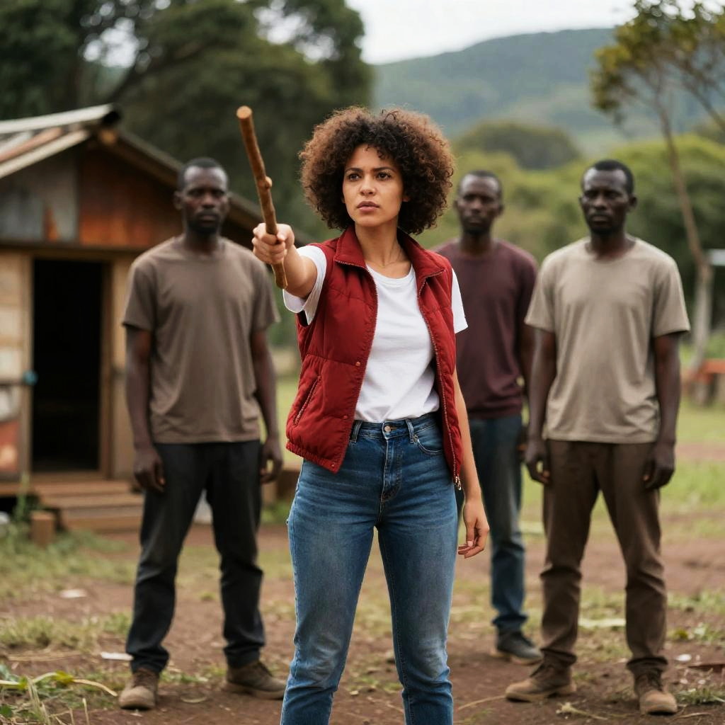 Photograph of a forest scene. Central woman with afro, red vest, and blue jeans points forward with wooden stick. Three men in casual clothing stand behind her, tense expressions. Rustic hut in background, green trees, hills.