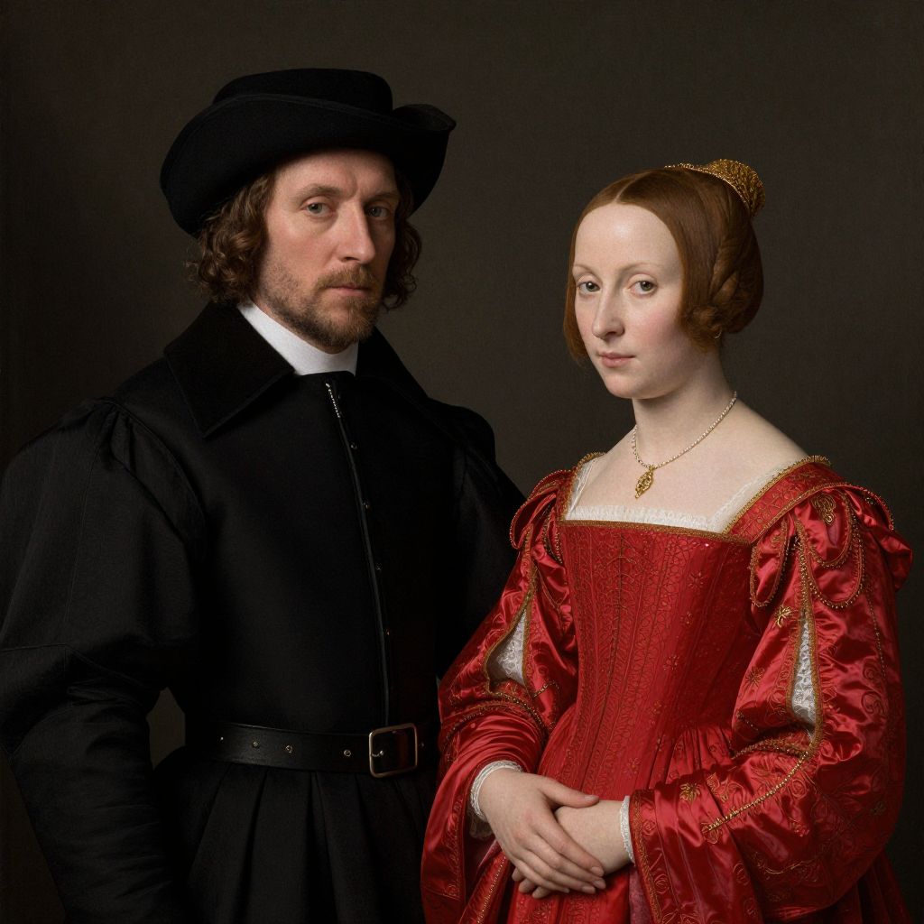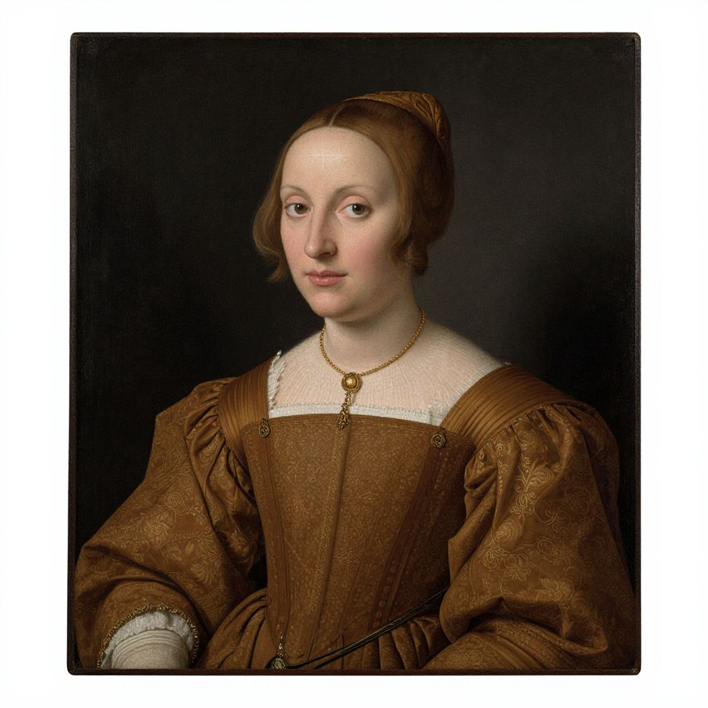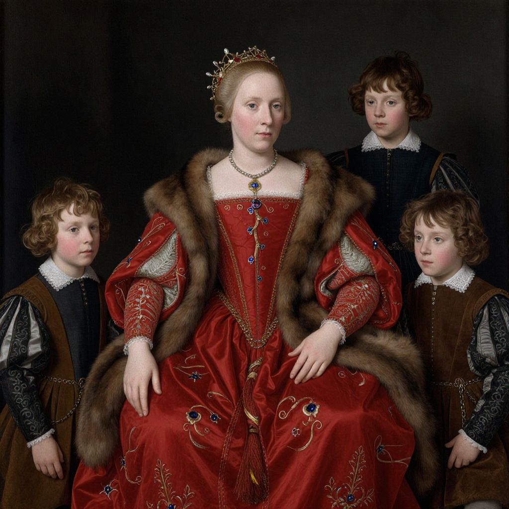 Renaissance era portrait of a noblewoman with a mink pelt over her shoulder, surrounded by her three young sons
