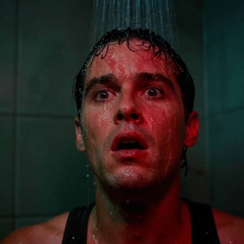 Pulp Fiction shower scene, stylized neon lighting, close-up of shocked face under water, 90s cult classic vibe, gritty textures, film noir influence, moody shadows