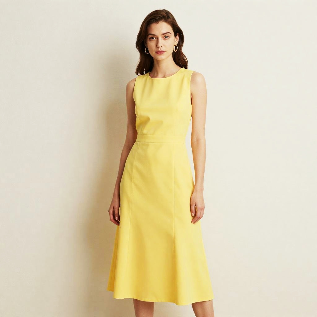 Yellow Theme Dress, a woman in a yellow dress standing in front of a wall