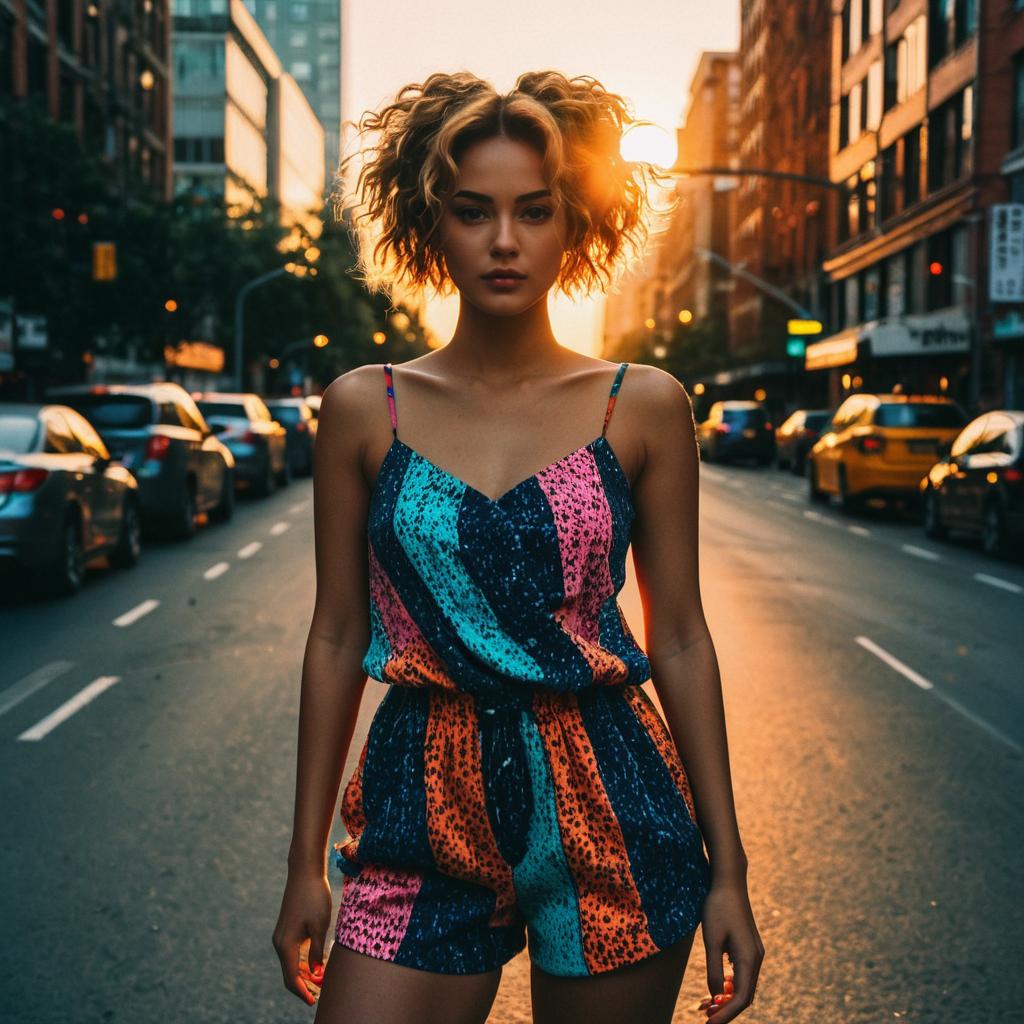 Twist Sponge hairstyle on female model, wearing colorful urban romper, in city street, captured in fashion editorial style with dramatic sunset glow.
