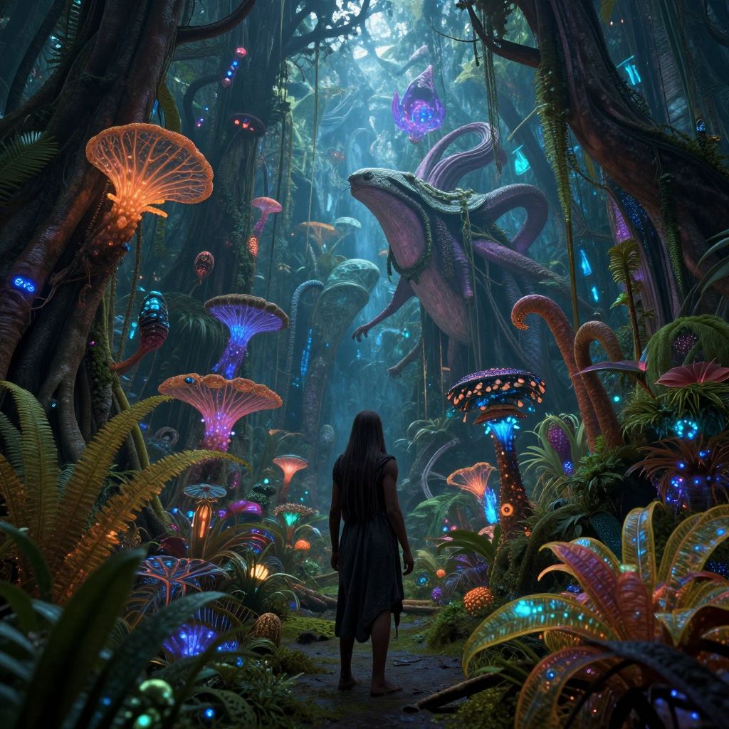 Nonhuman creature in a dense alien jungle, bioluminescent plants and strange fauna, mysterious and ethereal ambiance, vivid colors and intricate details capturing otherworldly beauty