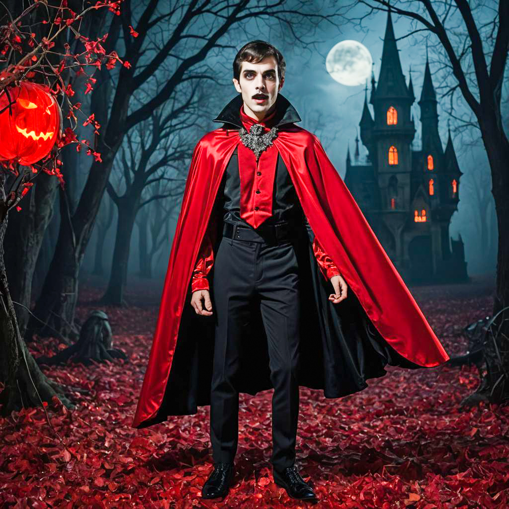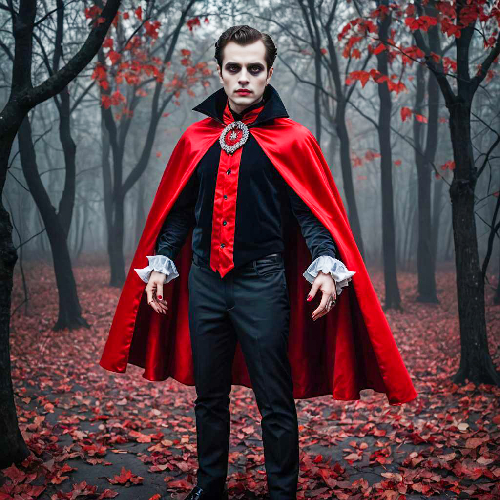 A young man dressed as a vampire, wearing a dramatic red satin cape with a jeweled collar, black shirt with red accents, and black pants. His face is painted pale with dark eye makeup and red lips, standing in a misty forest with red fallen leaves, creating a spooky Halloween atmosphere.