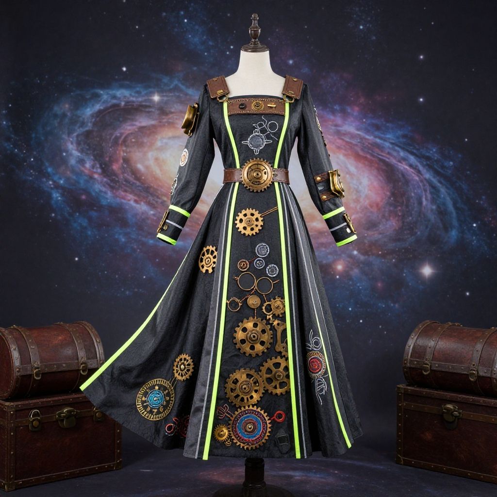 Elegant treasure planet costume with a steampunk flair, combining flowing fabrics, brass gears, and advanced tech accessories, highlighted by bright neon strips and intricate embroidery, posed on a backdrop of swirling galaxies and floating treasure chests.