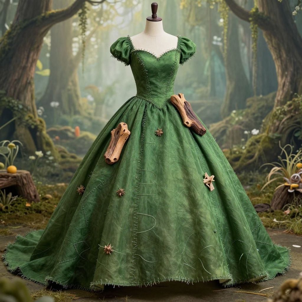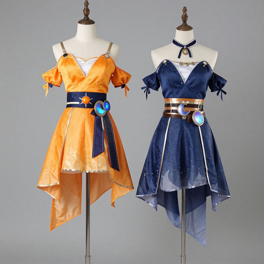 Photograph of a Victorian-style dress displayed on a mannequin, adorned with colorful gears and illuminated stripes, against a cosmic galaxy backdrop with two leather