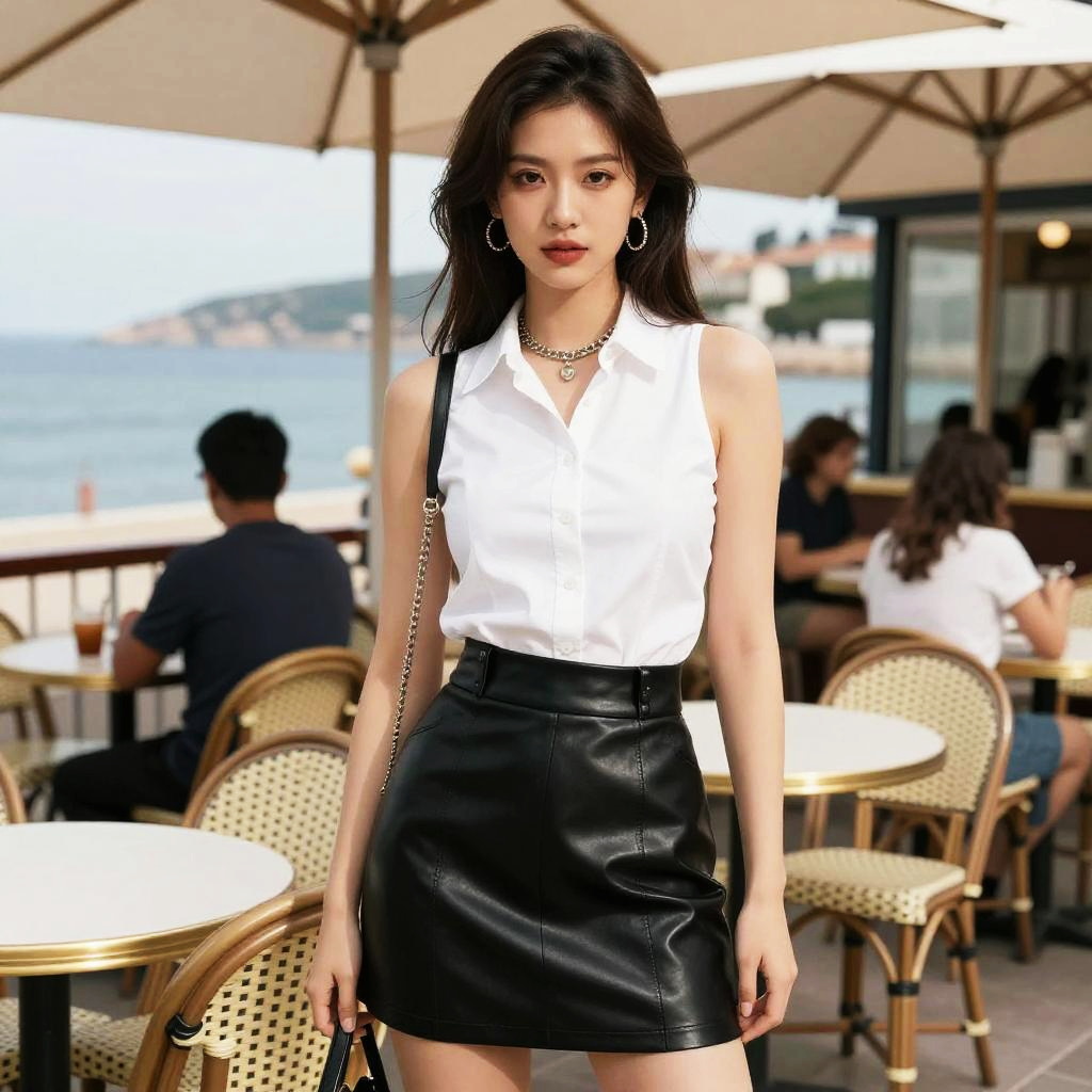 A woman in a shogakukan style, contemporary with a punk twist, wearing a sleeveless white button-up shirt and a black high-waisted faux leather skater skirt, stands at a French Cafe in a Coastal Town. Sexy. Pretty face and beutiful eyes