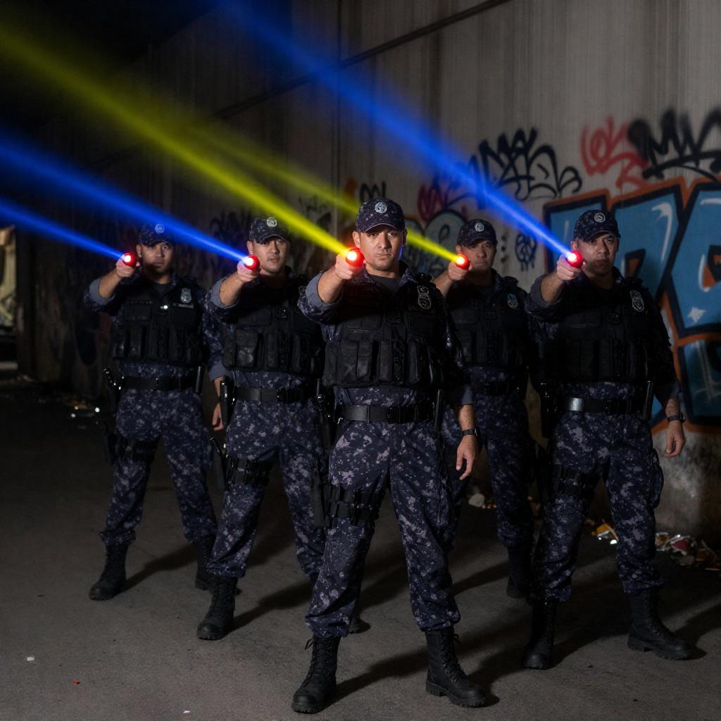 Photograph of four male police officers in dark camouflage uniforms, standing in a dimly lit, graffiti-covered urban alley. They are pointing red laser pointers forward, with blue and yellow light beams illuminating the scene from the left. Debris is scattered on the ground. The officers are positioned in a line, with one in the center slightly ahead of the others.