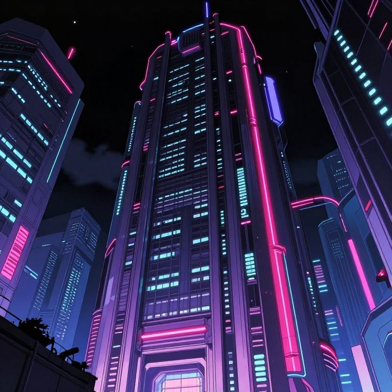 A futuristic, neon-lit building in a cyberpunk cityscape, reminiscent of Tsutomu Nihei's manga aesthetic and the \"Ghost in the Shell\" anime, with atmospheric neon lights and intricate architectural details.
