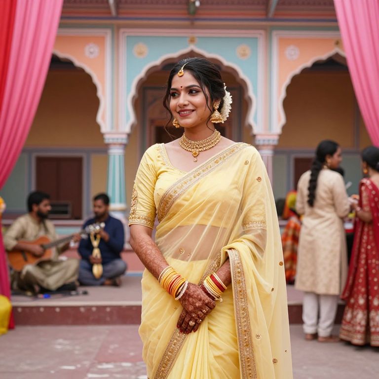 A traditional haldi attire bride posing in front of a colorful haveli with arches and painted walls, wearing a light yellow saree with gold thread detailing and a matching choli. Her face is slightly tilted with a joyful expression, her hair loosely tied in buns with bangles. The room is filled with soft music, pink and red fabric drapes, and guests in traditional kurtas and lehengas in the background.