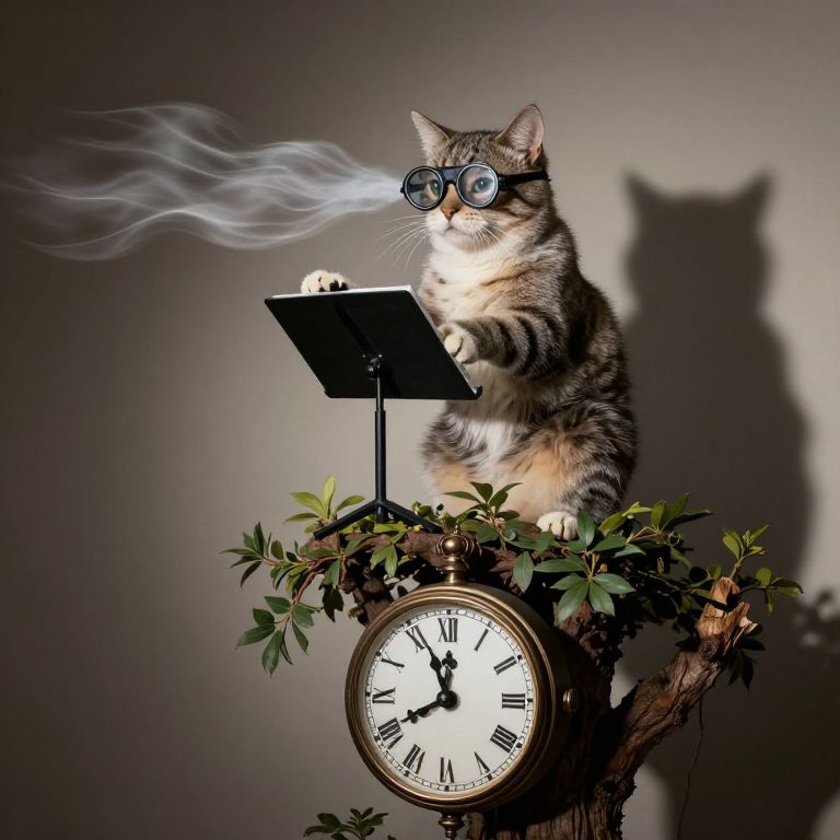 An elderly cat wears a monocle and conducts an invisible orchestra of wind and shadow from atop a clockwork tree.