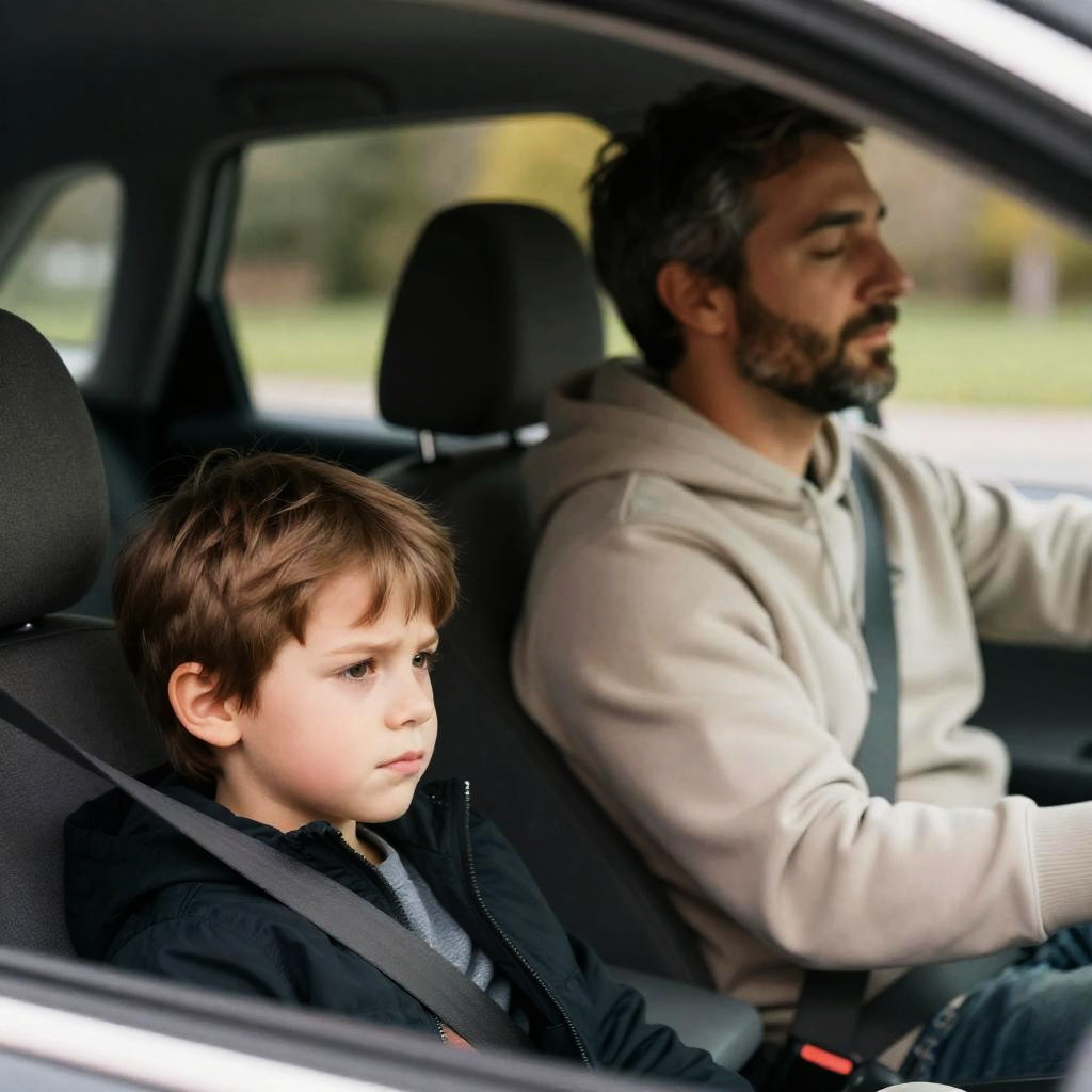 Older man with gray beard and mustache, wearing dark jacket, raises right hand in car, smiling, seatbelt visible. Woman with purple hair, white and green shirt, smiling, in background. Car interior, dim lighting. Two people.