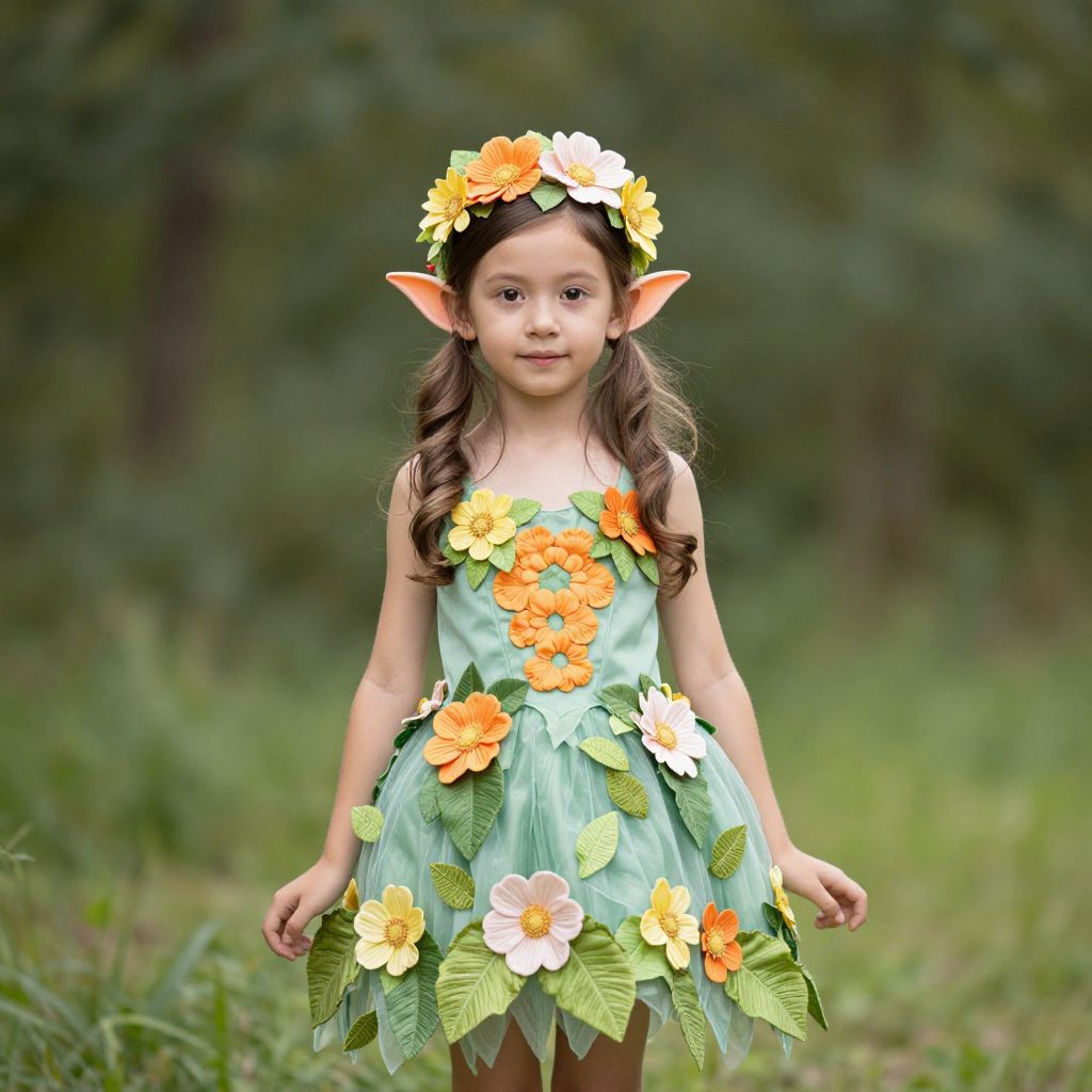 Photograph of a young girl with elf ears, wearing a green floral dress with orange and white flowers, and a matching flower crown, standing in a