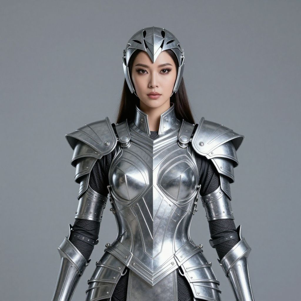 Photograph of an Asian woman in full silver medieval armor with a helmet, standing against a plain gray background, displaying a strong, confident expression.