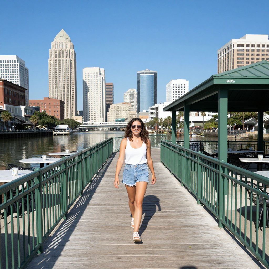 Photograph of a woman with long brown hair, wearing a white tank top and blue denim shorts, walking on a green bridge, with a vibrant city
