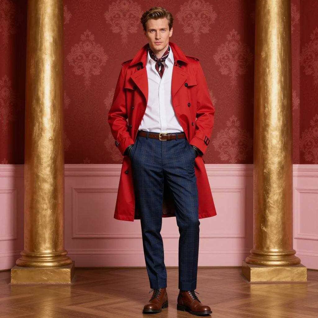 Butlins red coat costume, photorealistic, male, standing, full body, front view, short brown hair, light skin, blue eyes, wearing red trench coat, white dress shirt, patterned neck scarf, blue plaid pants, brown leather belt with gold buckle, brown lace-up boots, black leather gloves, hands in pockets, background red ornate wallpaper, two golden columns, pink paneled wall, wooden floor, formal, elegant, stylish, sophisticated, confident expression