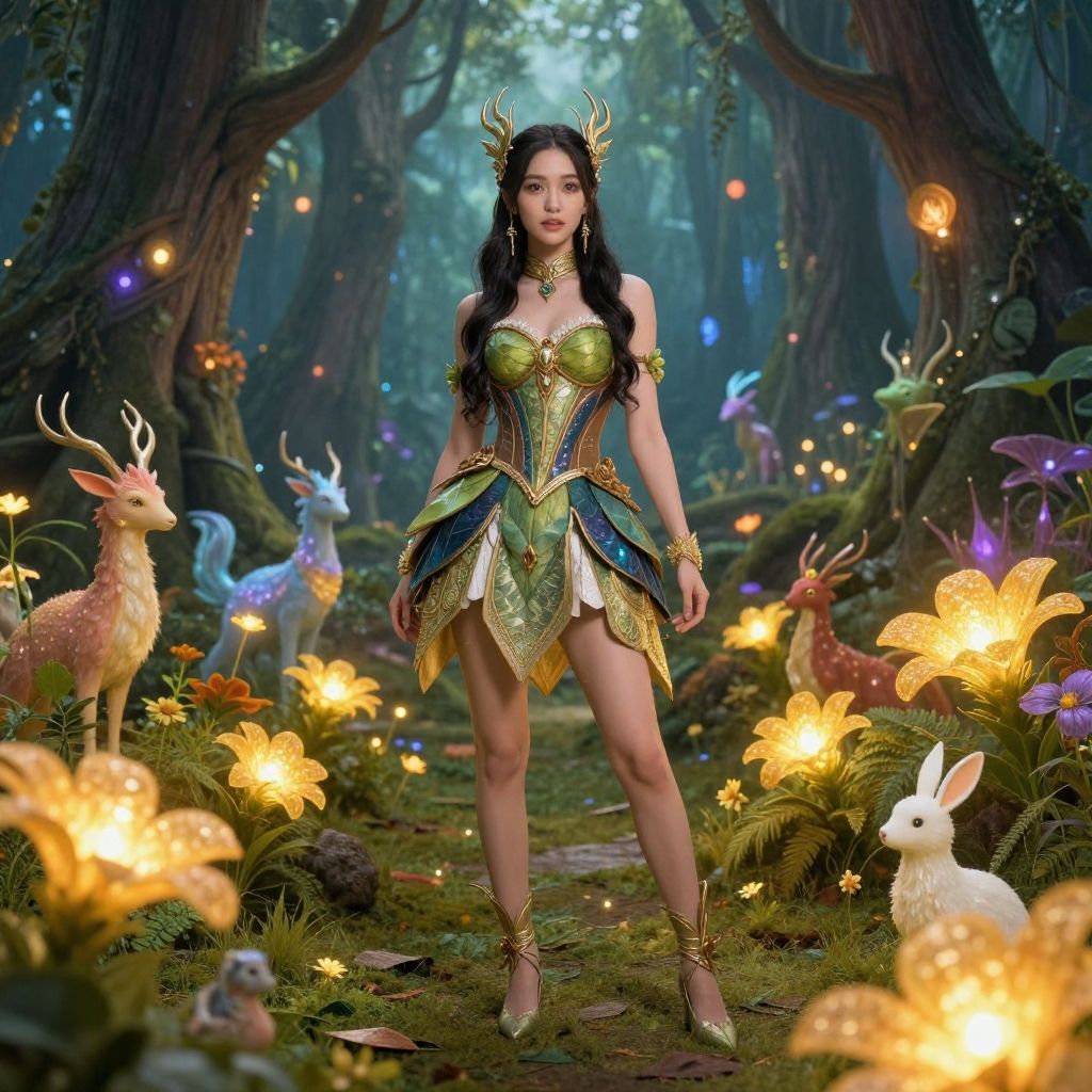 A digital fantasy artwork depicts a young Asian woman with long black hair and fair skin, standing in a magical forest. She wears a green and gold leaf-like dress with ornate details, and gold anklets. She has a golden crown with antlers. Surrounding her are glowing, luminescent flowers and ethereal animals, including deer, a blue deer, and a white rabbit. The forest is dense with towering trees and illuminated by soft, magical lights. Her confident stance and the enchanted forest create a whimsical, fairy-tale atmosphere. The image is highly detailed and vibrant.