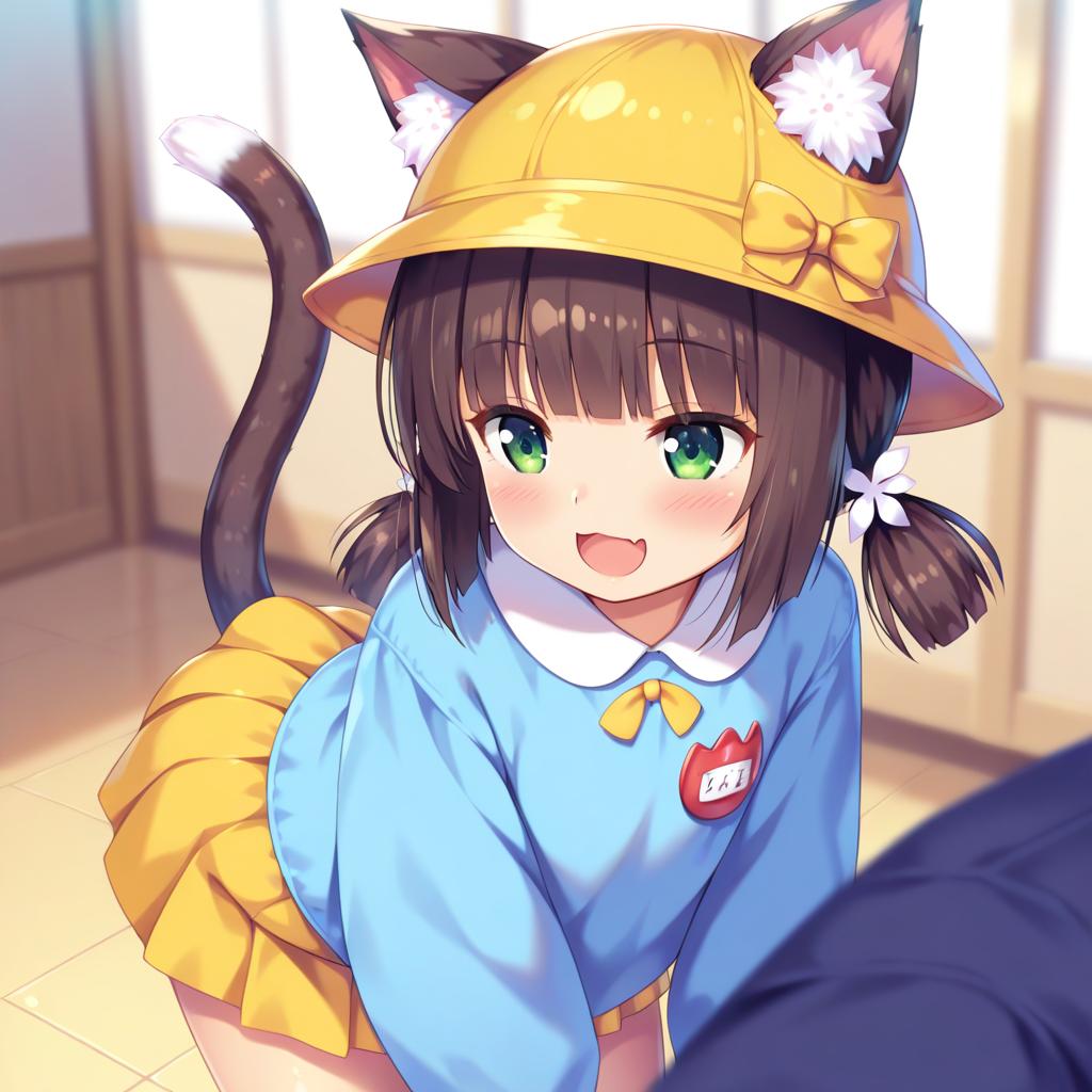 Mutsuki (azur lane), azur lane, 1girl, cat girl, cat ears, cat tail, fang, animal ear fluff, green eyes, brown hair, short hair, long hair, short twintails, blunt bangs, kindergarten uniform, school hat, kindergarten uniform, yellow headwear, blue shirt, yellow skirt, by artist a.x., illustrious