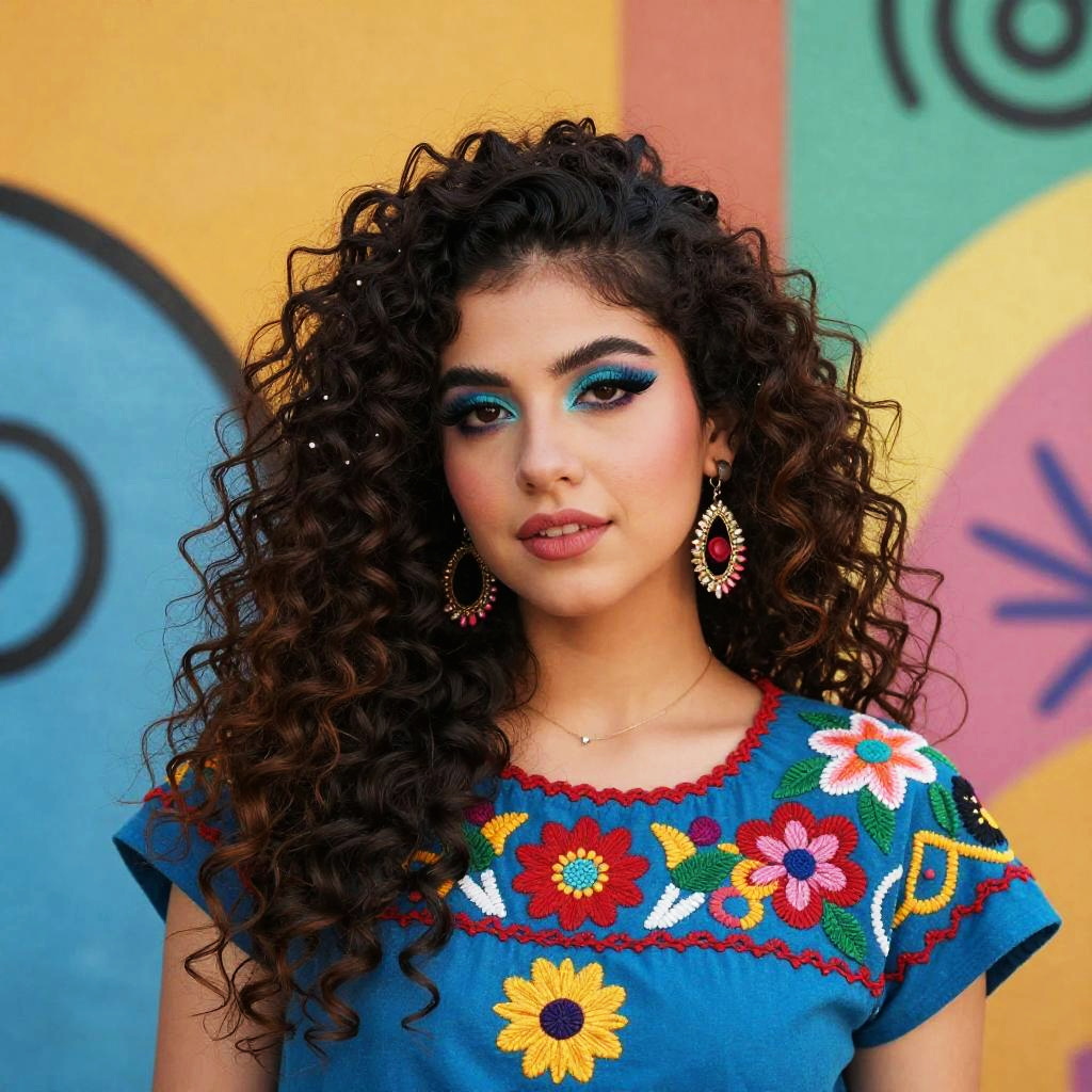 Mexican 80s style portrait of a young woman, bright makeup, big curly hair, traditional embroidery mixed with 80s punk fashion, colorful background with graffiti art