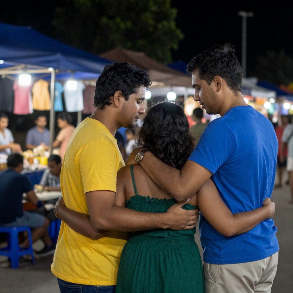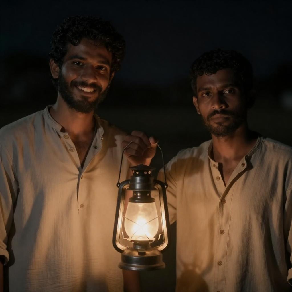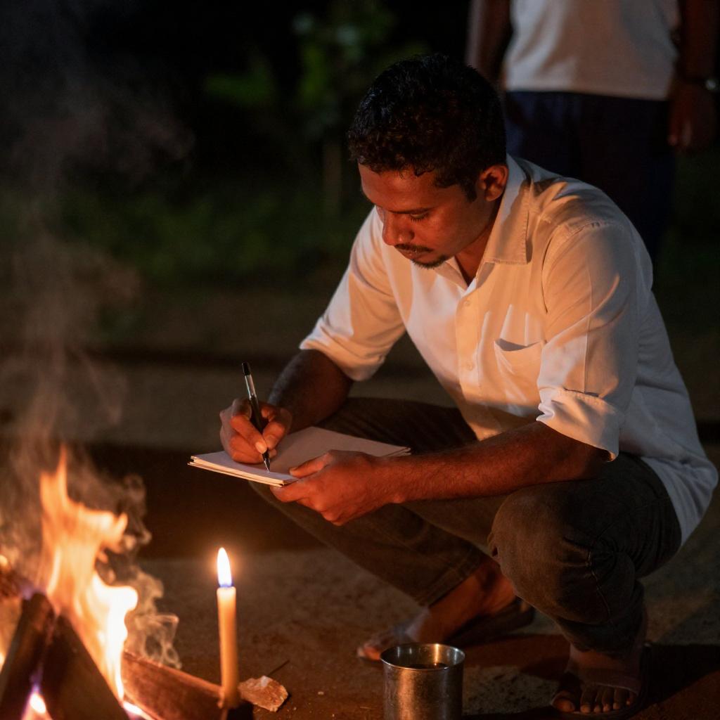 Man with dark skin, short black hair, wearing a white shirt, crouches by a small fire at night. He holds a pen and paper, writing by the light of two burning candles. A metal cup is on the ground beside him. Background is dark, with blurred greenery and another person partially visible in the distance. Intense focus on writing.