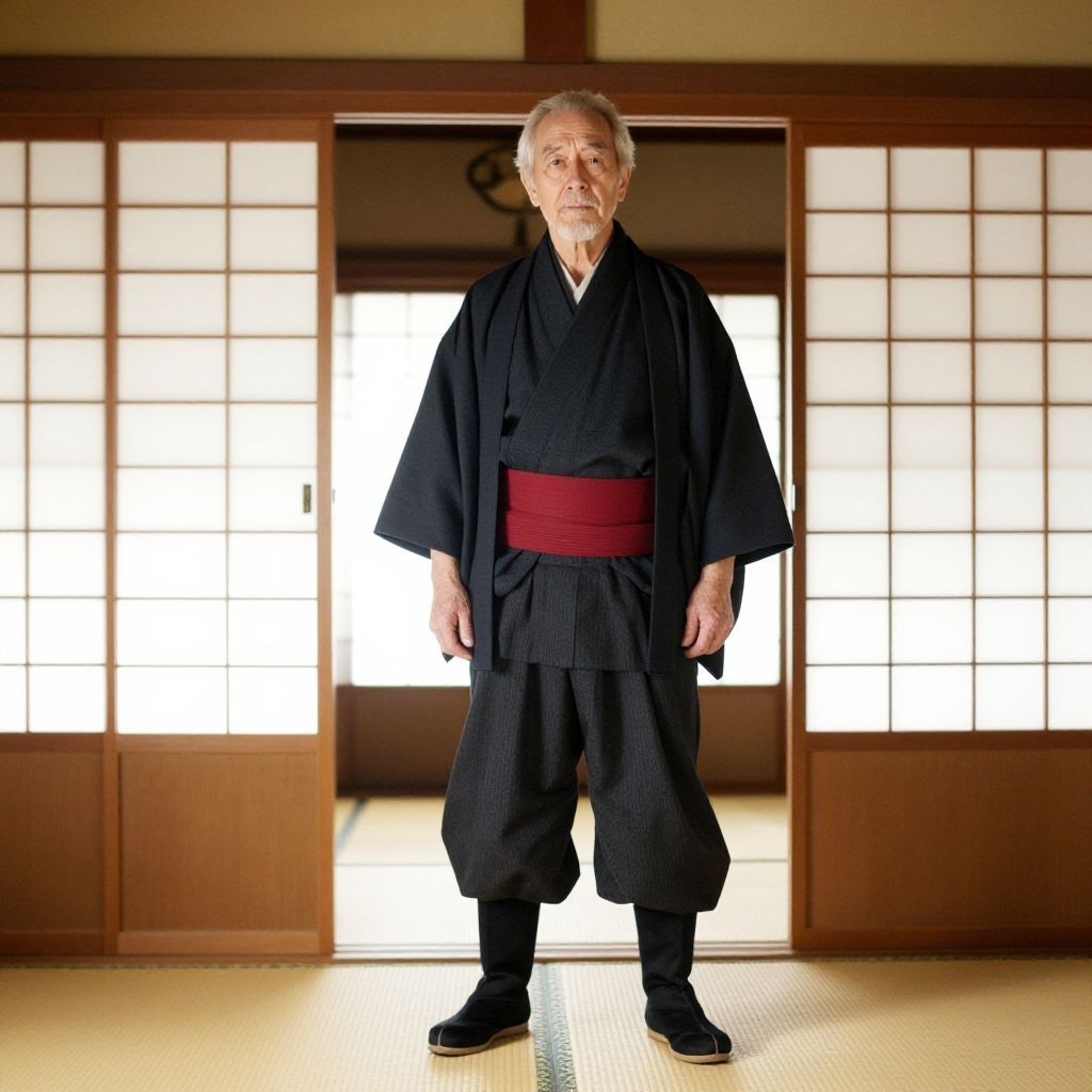 An elderly man stands confidently in a traditional Japanese room featuring shoji screen doors and tatami mats. He is dressed in a layered outfit with oversized clothing elements, combining a dark kimono-style top, a red waist sash, loose pants, and black boots, blending traditional and modern fashion styles.