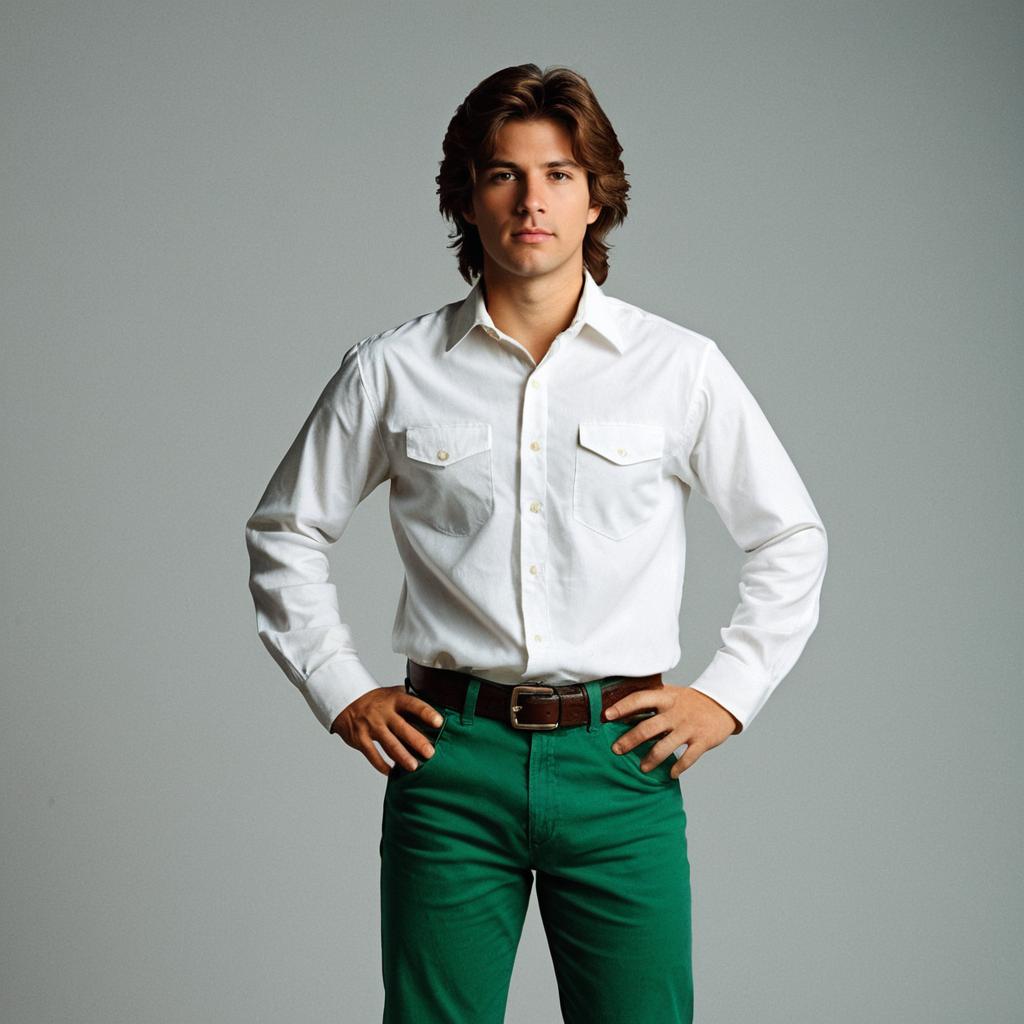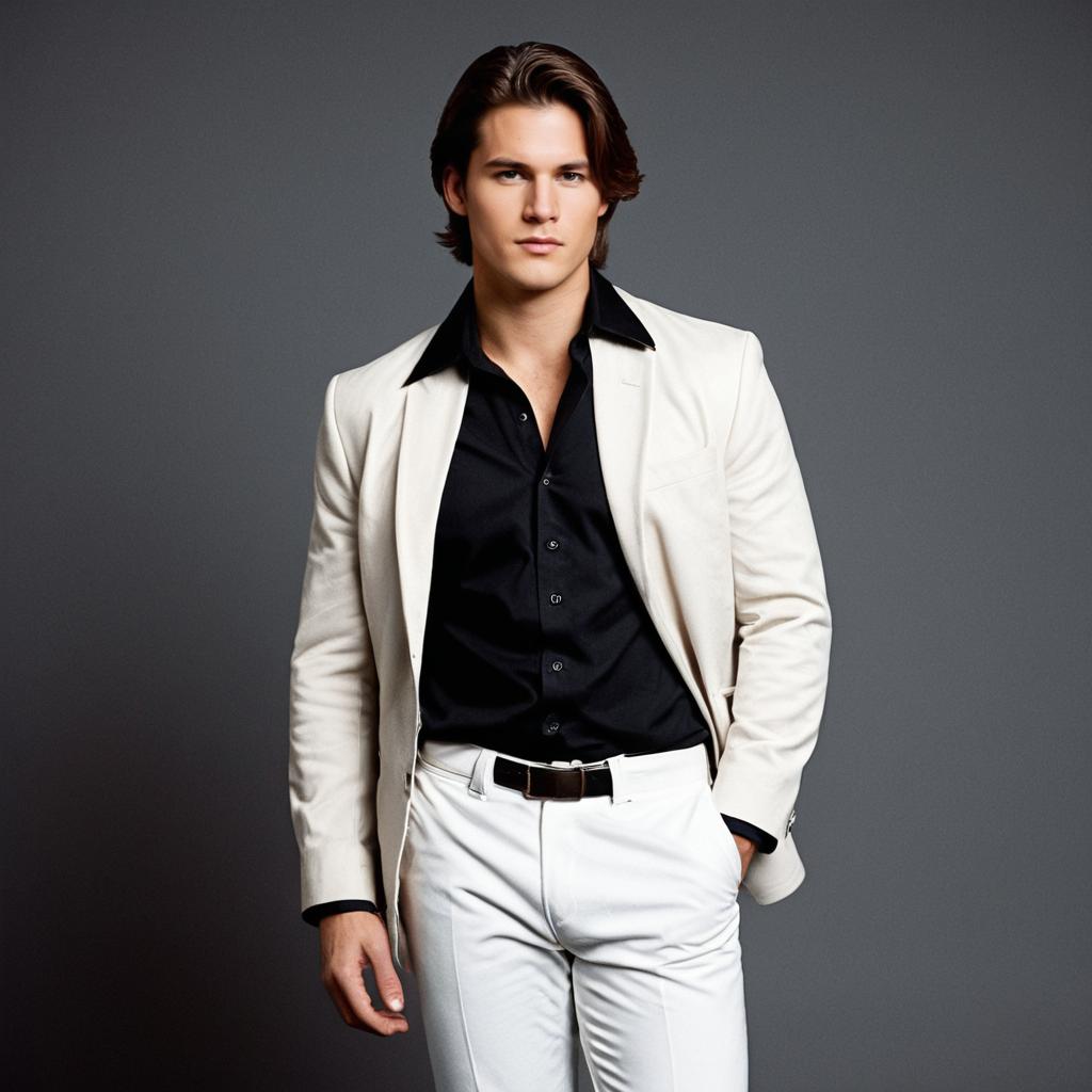 Portrait of a young man with brown hair wearing a dark denim button-up shirt over a white undershirt, paired with white pants and a brown belt. He is standing against a plain grey background, holding a brown leather bag in one hand and looking directly at the camera with a neutral expression.