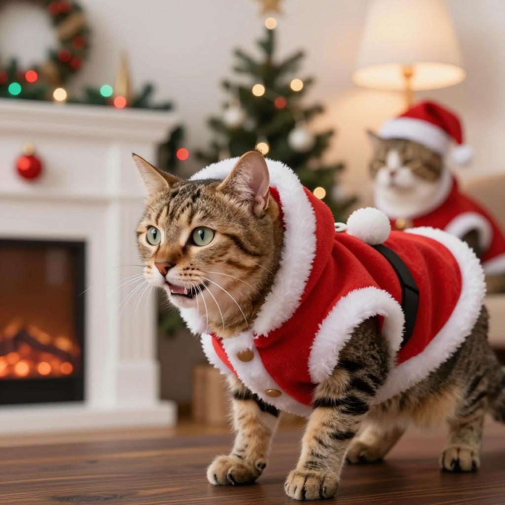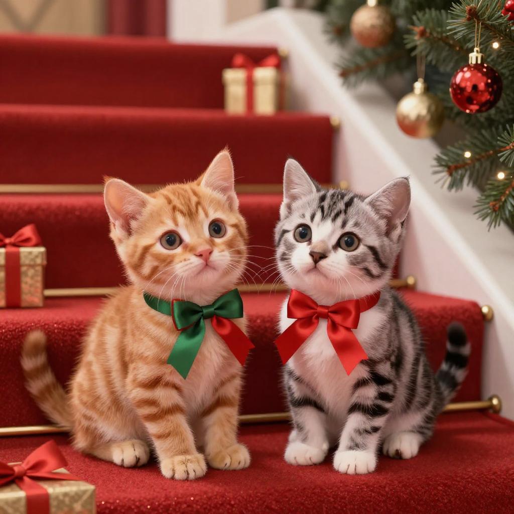 This detailed, festive illustration features two adorable kittens sitting on a red-carpeted staircase. The orange tabby kitten wears a green and red ribbon, while the black and white striped kitten sports a red bow. Both have large, curious eyes. The background, filled with Christmas decorations and a small gift, is slightly blurred. The lighting is soft, and the camera angle is slightly low, capturing the kittens' cute expressions. The depth of field keeps the kittens in sharp focus.