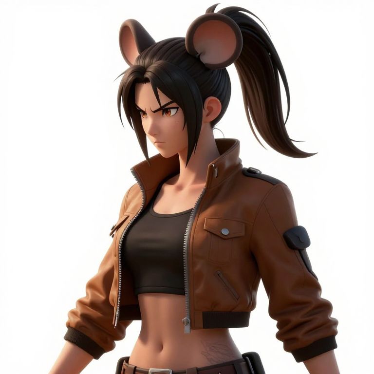 The image depicts a highly detailed, cell-shaded anime character with a strong and powerful presence. The character is a female with mouse ears, wearing a brown jacket over a black top. Her hair is styled in a high ponytail with a black band, and she has a serious expression on her face. The background is a simple white limbo, which emphasizes the character's silhouette and the intricate details of her outfit. The overall composition is epic, with the character positioned in a profile pose that showcases her strength and determination. The art style is professional, with a focus on realism and texture, and the image appears to be a trending piece of digital art from the 2020s, likely created using software like Octane. The character's design and the use of light and shadow create a dynamic and engaging visual experience.