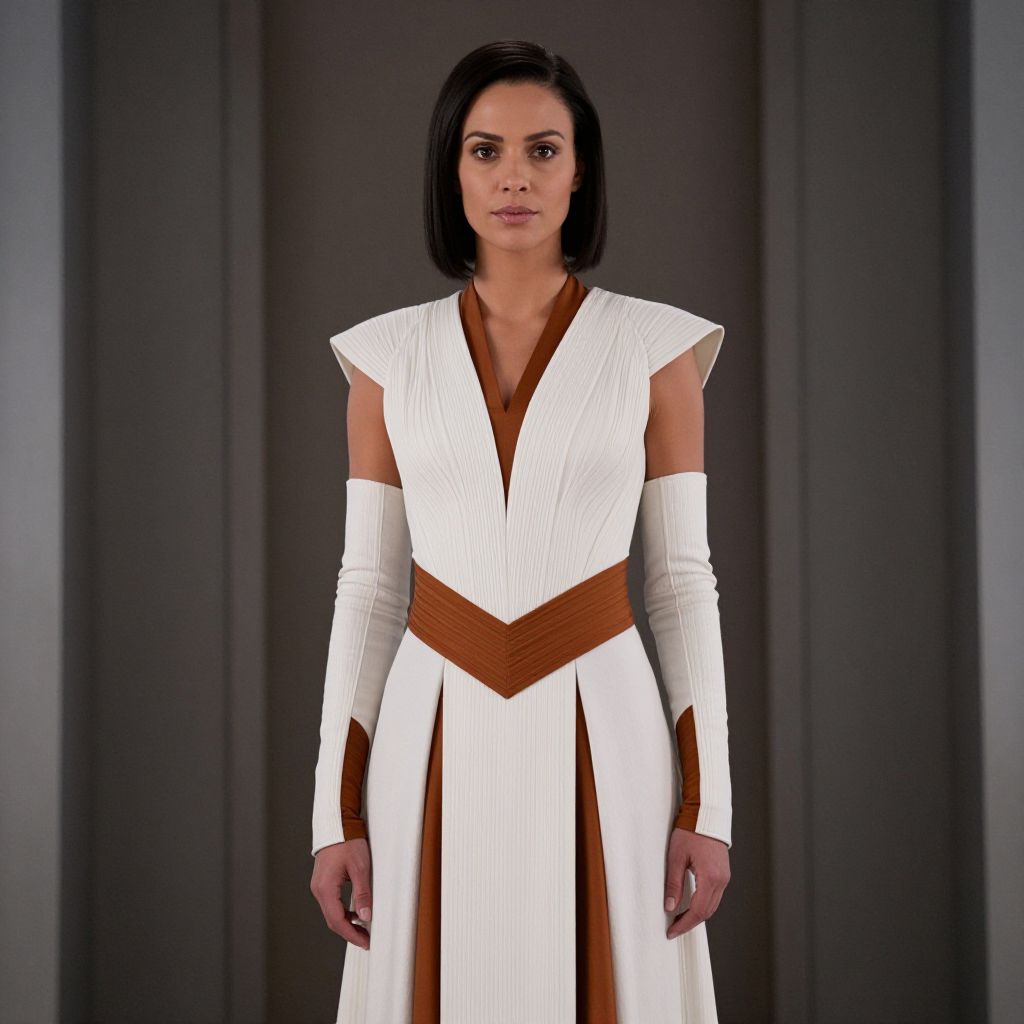 Padme Amidala Episode Costume, a woman in a white and brown dress standing in a room