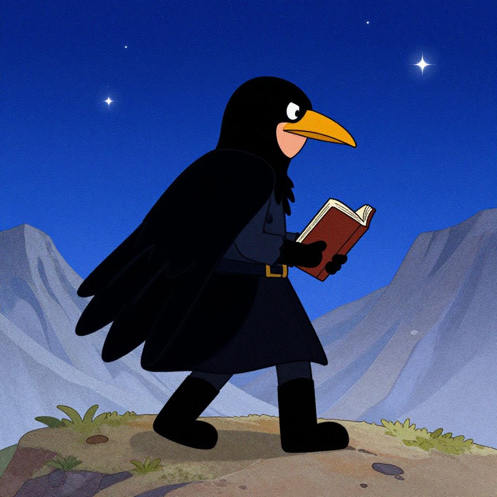 Opaque Young adventurer dressed in a raven costume, holding a book, exploring the mountain under the starry sky. Cartoon manga style. Drawing.,