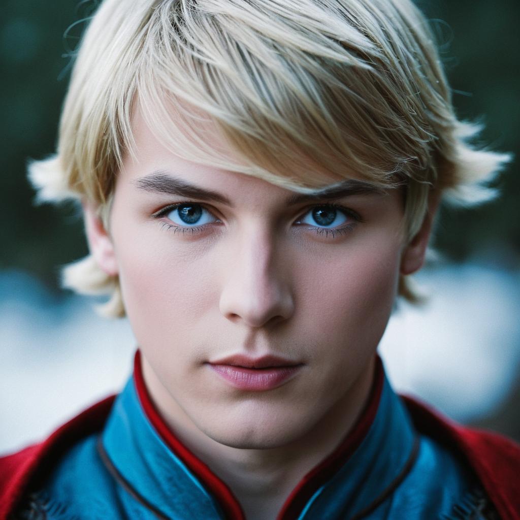 Close-up portrait of a young blonde man with green eyes wearing a green and red Adam Strange themed hoodie, look intense wearing hood up, outdoor background.