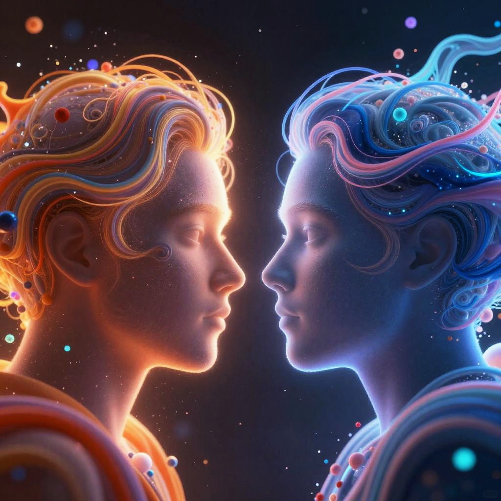 Dalle 2 vs stable diffusion, symbolic representation with two opposing forces of colorful, electrified particles merging and diverging in a cosmic data storm, conveying the power and creativity of AI image synthesis with glowing, fluid shapes.