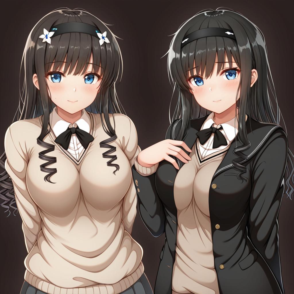 Digital illustration of two anime-style girls with long black hair and blue eyes, wearing Kibito High School uniforms. The girl on the left wears a beige sweater over a white shirt with a black ribbon tie, adorned with white flower hairbands. The girl on the right wears a black blazer over a similar beige sweater and white shirt, also with a black ribbon tie and a black hairband. Both characters have prominent large breasts and curly hair strands framing their faces, set against a dark background.