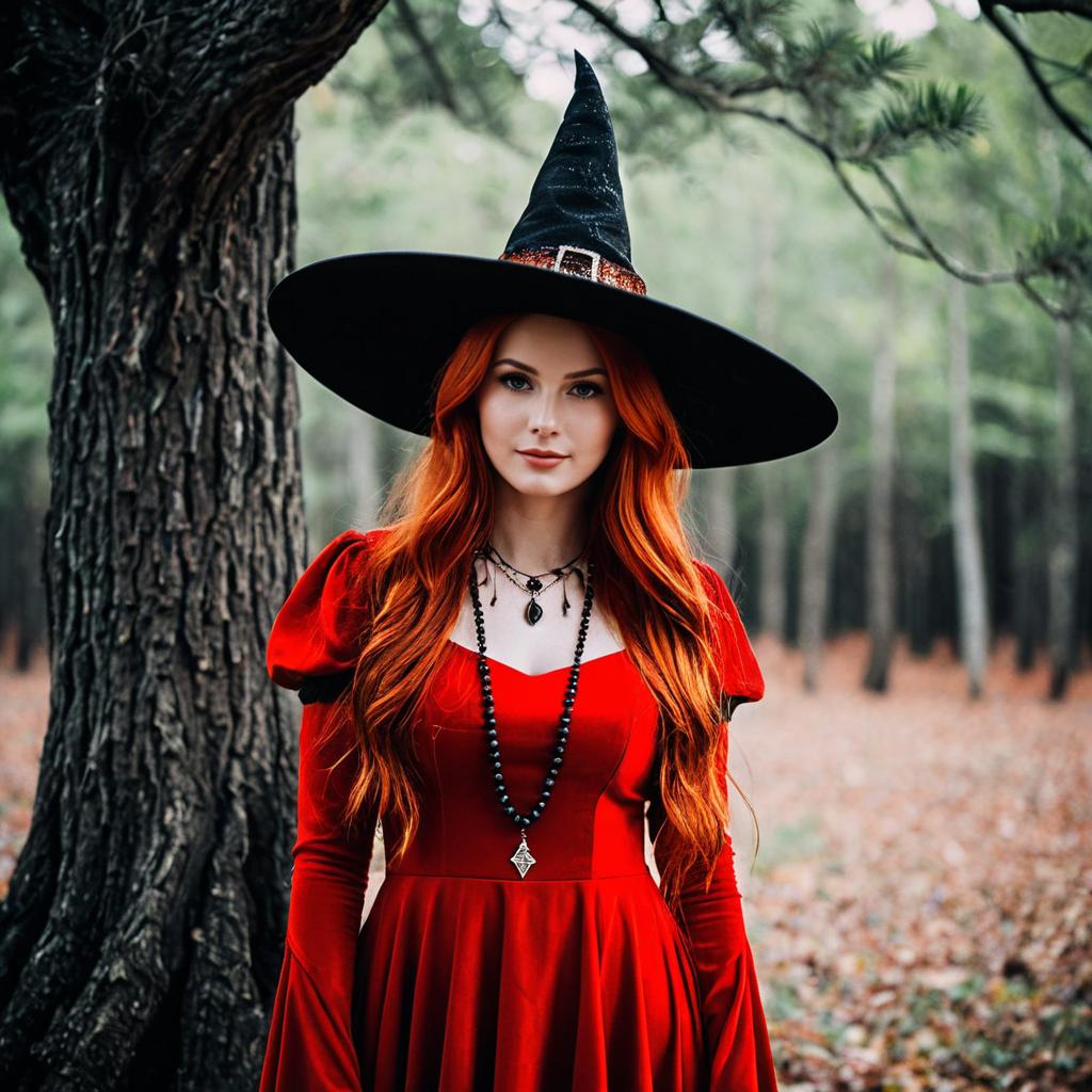 Portrait of a woman with long red hair wearing a red witch costume and a large black witch hat. She is standing outdoors near a tree, wearing a red dress with puffed sleeves and layered black necklaces. The background is a blurry forest with fallen leaves on the ground.