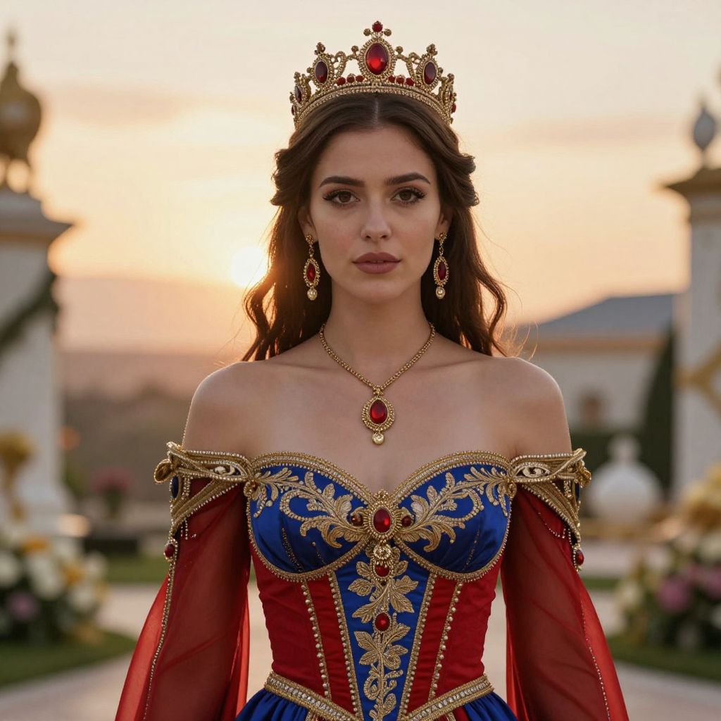Photograph of a beautiful woman with long brown hair, wearing an ornate red and blue corset dress, gold crown, and red gemstone necklace