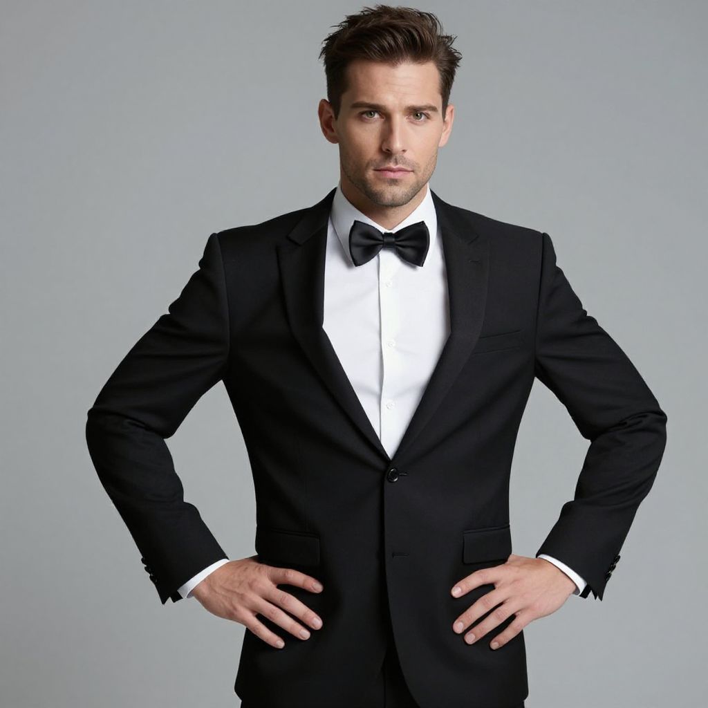 Photograph of a handsome, light-skinned man with short, dark brown hair and a neatly trimmed beard. He is wearing a black tuxedo with a white dress shirt and a black bow tie. His hands rest on his hips, and he gazes directly at the camera with a confident expression. The background is a plain, light gray, which contrasts with his dark suit. The image has a professional, studio-quality appearance with even lighting and sharp focus.