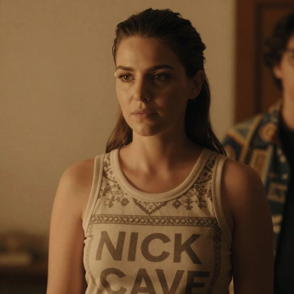 Photograph of a woman with light skin and dark brown, slicked-back hair. She wears a sleeveless, beige top with a patterned design and the "NICK CAVE" in bold letters. She has a neutral expression, looking slightly to the left. The background is softly lit with warm, yellow-orange light. Another person with a patterned garment is partially visible on the right. The setting has a dim, indoor atmosphere.
