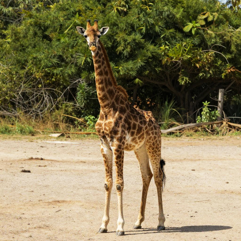 Photograph of a solitary giraffe standing on a sandy, sunlit path in a natural habitat. The giraffe has a tall, slender frame with a distinctive pattern of large, irregular brown patches on a lighter tan coat. Its long neck is upright, and its head is facing forward, with small, dark eyes and tufted ossicones (horn-like structures). The background features dense, green foliage with various trees and shrubs, partially shaded. The ground is mostly dry, sandy, and scattered with small twigs and leaves. The bright sunlight casts clear, sharp shadows, highlighting the giraffe's textured coat.