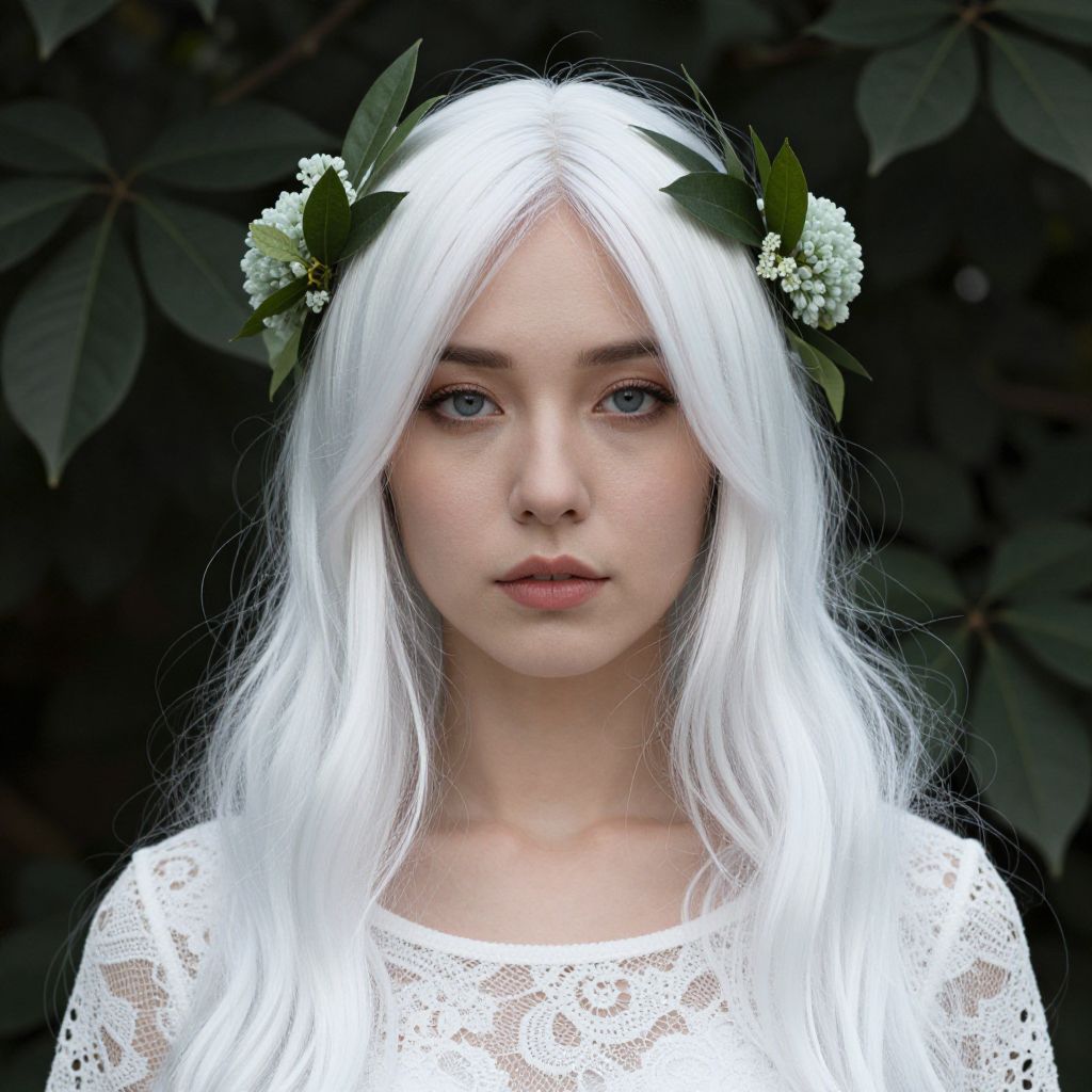 A woman with white hair adorned with green leaves and flowers, wearing a white lace top, set against a dark, leafy background.