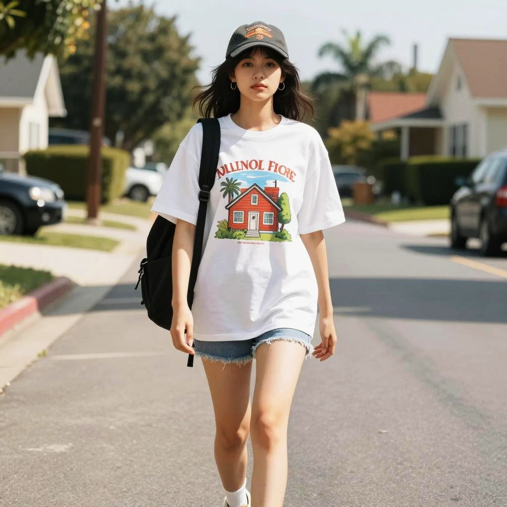 Young Asian woman standing on a skateboard outdoors, wearing a red jacket, red baseball cap, blue athletic shorts with white trim, white socks, and white sneakers. The setting is an urban street or skate park with gray pavement and large windows in the background.