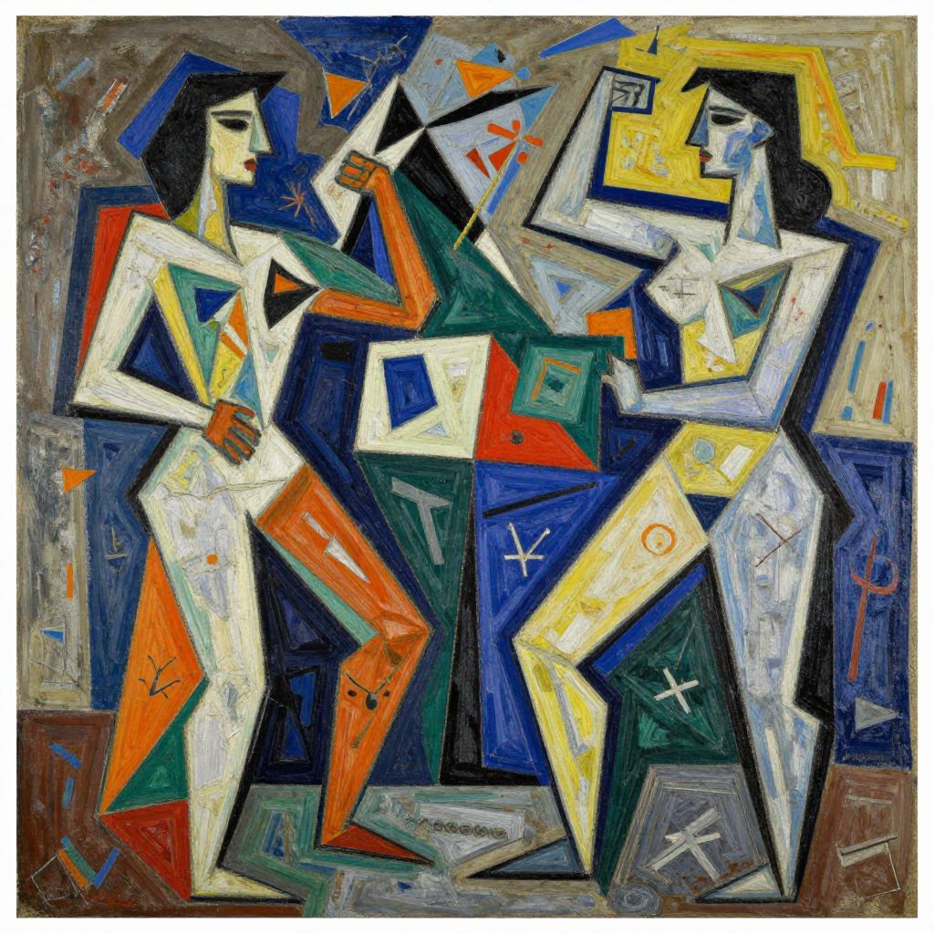 This is a vibrant, abstract painting in a Cubist style, characterized by bold, geometric shapes and vivid colors. Two stylized human figures, one with black hair and white, orange, and green attire, and the other with black hair and white, yellow, and blue attire, are depicted in dynamic, angular poses. The background is a chaotic mix of dark blues, greens, and oranges with sharp, intersecting lines and shapes. The figures' faces are simplified and abstract, with prominent, angular features. The painting is textured with visible brushstrokes and a rough, layered surface, enhancing its energetic and expressive quality.