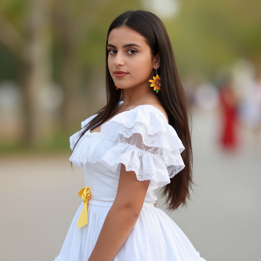 Spanish fiesta dress, 1girl, solo, dress, long hair, jewelry, brown hair, earrings, flower, brown eyes, outdoors, white dress, blurry, standing, photo background