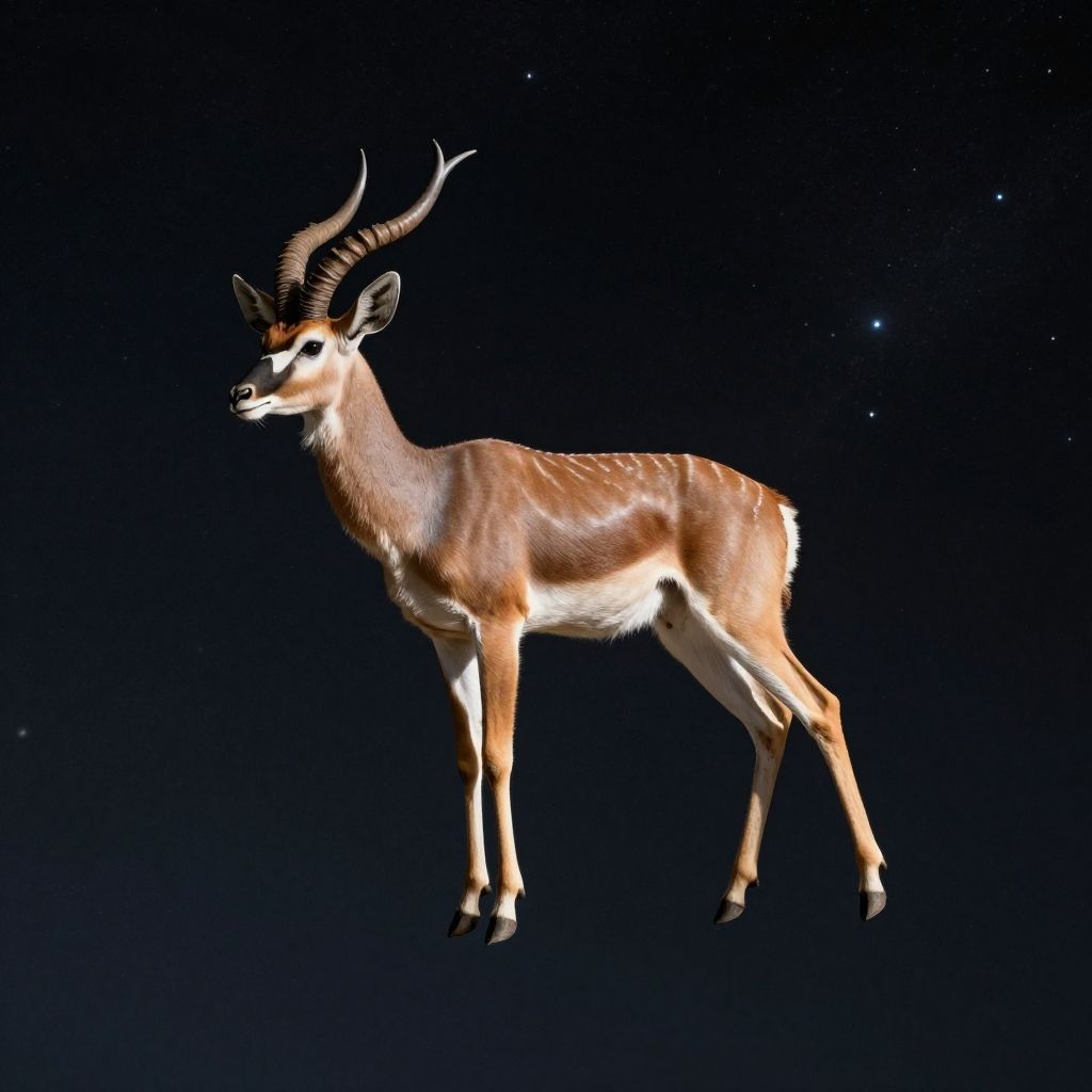 Photograph of a single, slender antelope with a light brown coat, white underbelly, and dark brown, curved horns. The antelope stands against a completely black, star-speckled background, creating a stark contrast. Its legs are thin and white-tipped, and it has black markings around its eyes. The antelope's ears are small and alert. The lighting highlights its smooth fur texture and muscular build, giving it a three-dimensional appearance. The image has a surreal, floating effect due to the dark, cosmic background.
