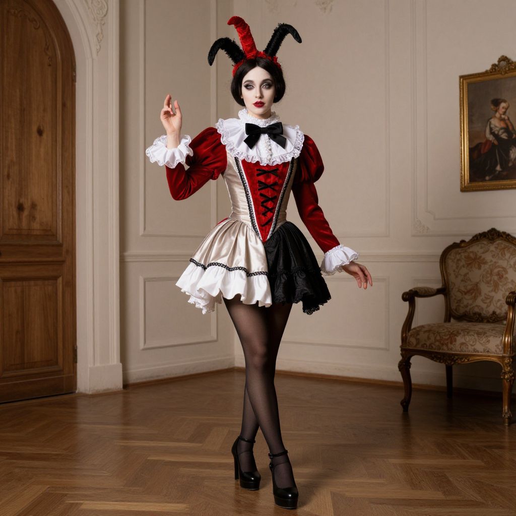 Photograph of a woman in a red and black jester costume with white lace, black stockings, and high heels, standing in an elegant, wooden
