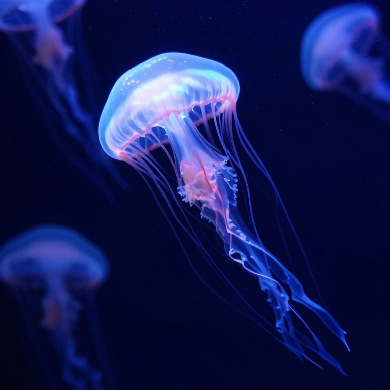 Photograph of a glowing blue jellyfish with translucent, frilled tentacles against a dark blue background. The jellyfish's dome-shaped bell is illuminated, showing a gradient from bright blue to pinkish hues near the edges. Several other jellyfish are blurred in the background, adding depth to the image. The jellyfish's delicate tentacles trail downward, creating a sense of gentle motion. The overall texture is smooth and ethereal, with a mesmerizing, almost otherworldly quality.