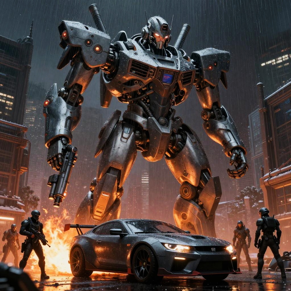 High-detail illustration of a towering mecha robot armed with weapons, standing amidst rain and fire in a dark urban environment. The scene features a futuristic sports car and multiple armed soldiers in tactical gear, set against a nighttime city backdrop with snow and dramatic lighting.
