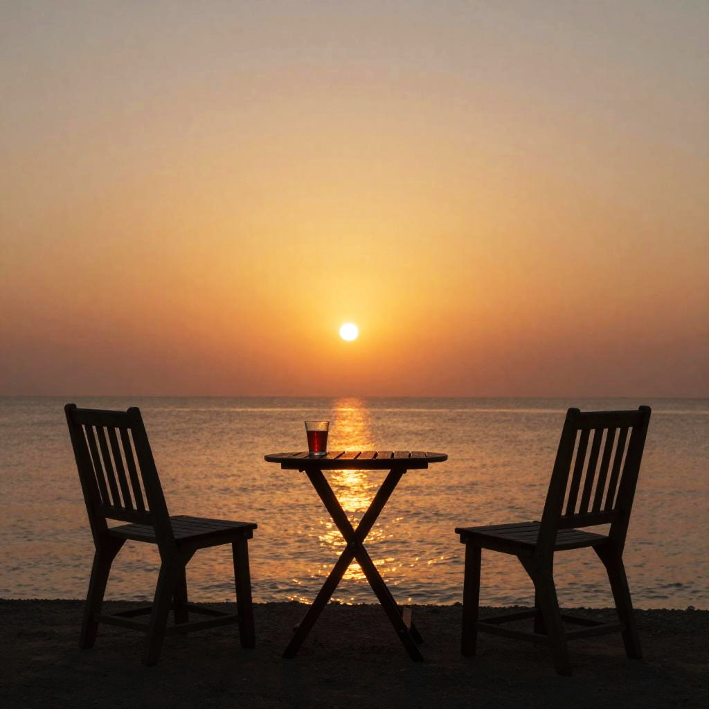 Photograph of a serene sunset over a calm sea. In the foreground, two wooden chairs and a small round table are silhouetted against the glowing orange sky. A single glass with a dark liquid sits on the table. The chairs are positioned facing the ocean, creating a peaceful, romantic atmosphere. The sun is low, casting a warm, golden light across the scene.