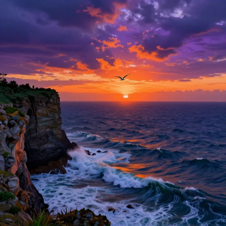 Imagine an enchanting seascape at sunset, with swirling brushstrokes and a vibrant color palette reminiscent of van Gogh's iconic style. The expansive, tumultuous ocean stretches towards a horizon where fiery oranges and deep purples blend with the indigo sky, creating a mesmerizing display of light. Majestic waves crash against rugged, moss-draped cliffs that rise dramatically from the churning sea, their textures captured in bold, expressive strokes. A lone seagull soars above, its silhouette etched against the brilliant twilight as it appears to embrace the awe-inspiring beauty of nature's fiery spectacle. This captivating scene evokes a sense of wonder and tranquility, inviting viewers on an emotional journey through the raw power and serenity of the untamed ocean.