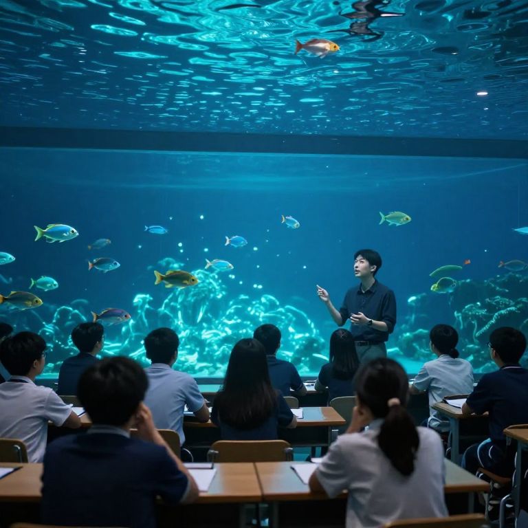 In a surreal, cyberpunk-inspired classroom illuminated by the ethereal glow of a phosphorescent lake, a school of articulate fish swims gracefully above, seemingly lecturing a group of puzzled humans seated below, creating a striking contrast between the natural aquatic world and the artificial human environment.