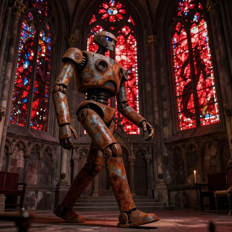 Photograph of a rusty, humanoid robot walking in a Gothic cathedral with vibrant red and blue stained glass windows.